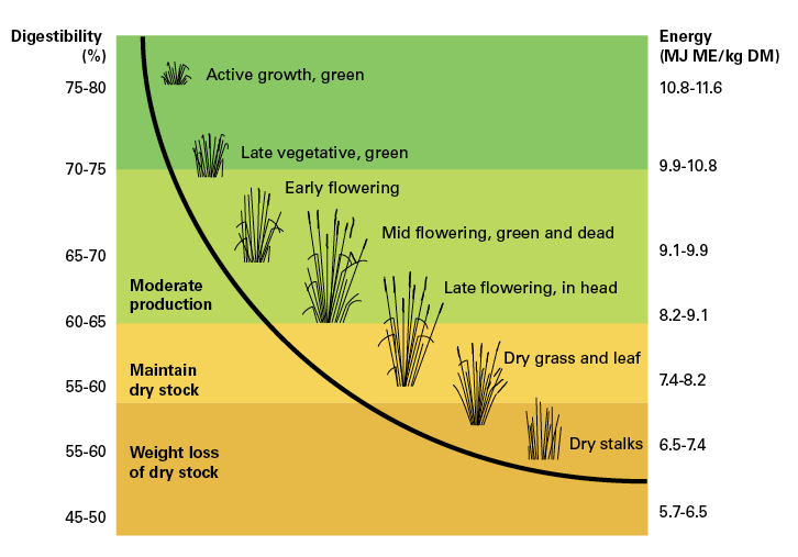 The figure below illustrates the relationship between feed quality, (digestibility and energy) and the capacity of pasture to sustain various production levels in grazing stock as the plants mature. It shows that as a plant matures, the digestibility and metabolisable energy decrease.