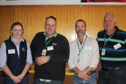 Photo: Natasha Morley (Rural Directions Pty Ltd consultant and SA Making More from Sheep state coordinator) with sheep producers, Craig Pietsh, Bordertown SA; Craig Lowe and Ed Neumann both from Mundulla SA at the MLA/AWI ‘It’s Ewe Time’ Forum at Lameroo, 25th August 2011