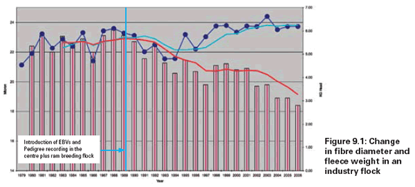Figure 9.1 illustrates 24 years of hogget fibre diameter and fleece weight records from a commercial flock. Rams were sourced from the same stud during that time. The result has been a reduction in fibre diameter by approximately 4 microns, and a simultaneous increase in fleece weight of 1kg per head. Most of the gains were made after 1992, when the selection emphasis in both the flock and its ram source moved from within-flock performance measurements to across-flock breeding values.