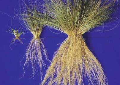 Plants are genetically programmed to maintain a set ratio between their shoots and their roots. When leaves and stems are removed by grazing, the plant sheds root material to re-balance the ratio. So, short, continuously grazed grasses will have small root systems like those on the left of the photo in figure 7.3, while pastures that are grazed and allowed to recover look more like the plant on the right hand side.