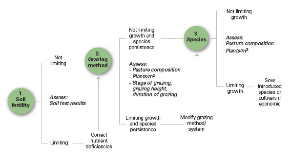 Use the decision tree (below) to help you determine if you can grow more pasture and to prioritise options. Measure your soils and pastures (activities indicated in bold and italics) to identify where you will get the biggest gains in pasture growth. This will then allow you to prioritise where to invest your time and dollars.