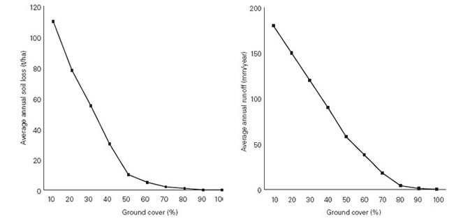 Figure 6.1: In the medium to high rainfall zones of eastern Australian, maintaining 70% groundcover can minimise both run-off and soil loss (Lang, RD (1998). Pasture management for both production and stability. Australian Society of Agronomy).