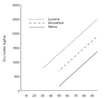 Figure 6.2: There is a strong relationship between available dry matter and groundcover (Lang, RD (1998). Pasture management for both production and stability. Australian Society of Agronomy).