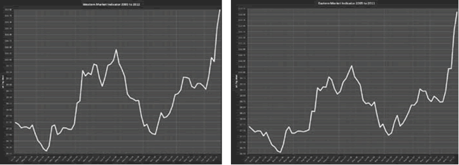 Figure 2.1 - Commodity price cycles in key wool markets over 15 years (Source: The Woolmark Company)
