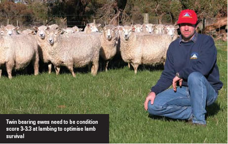 - Aim to have identified twin bearing ewes in condition score 3–3.3 at lambing to optimise survival.