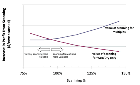 (90 foetuses/100 ewes joined) the value of scanning for multiples becomes higher than the